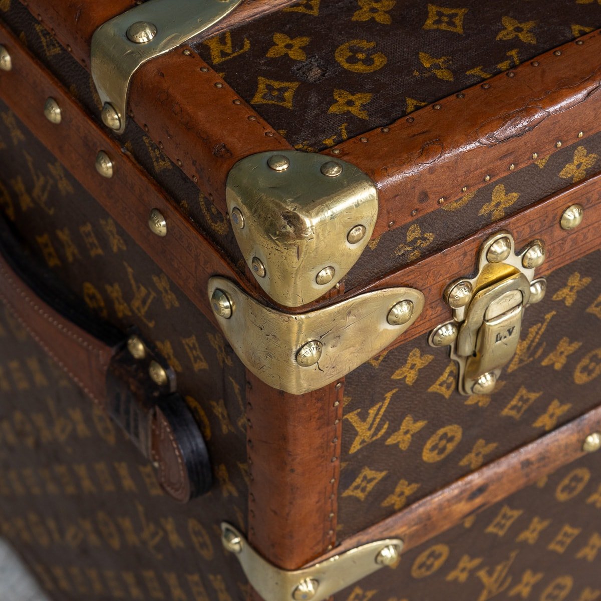 A magnificent and exceptionally rare Louis Vuitton shoe trunk, adorned with stencilled monogram canvas, lozine trim and brass fittings. Elevating its uniqueness is the remarkably uncommon size that distinguishes it from standard models. This extraordinary piece measures an impressive 90cm in length, an astounding 50% wider than the already scarce shoe trunks typically encountered. Dating back to the first half of the 20th century, this trunk was an indispensable possession for discerning elite travellers, evoking the grandeur of passenger ships and the first-class luxury of bygone eras.